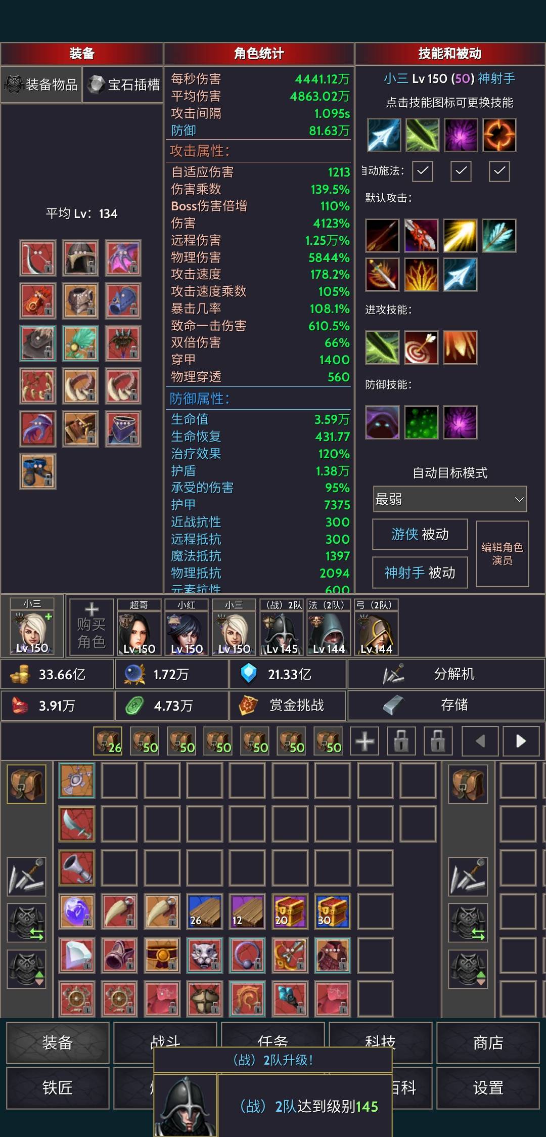 队形是战士(嘲讽+破甲+战吼),法师(闪电链+冰雨+披风,冰雨点出闪电类型),主力是弓(狙击+剑舞+消失),剑舞后期可随意更换。