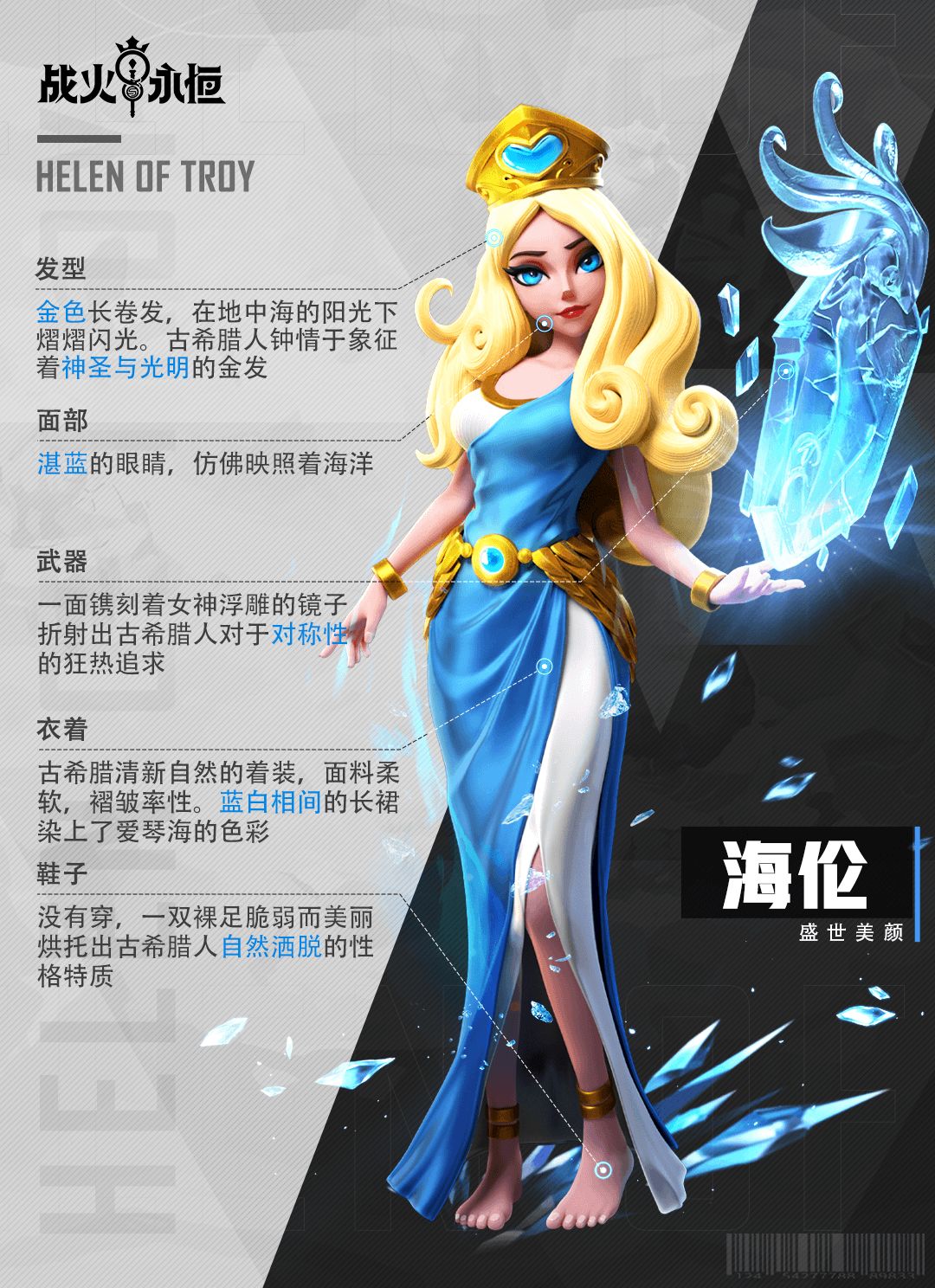 海伦在希腊人心目中,是世界上最美的女人。角色设计师在设计海伦形象的时候,无疑会展现她的美貌,但更注重强调她的“希腊性”。从配色到服饰,海伦浑身都散发着浓浓的地中海风情。话不多说,现在就来看看藏在形象细节里的小心机吧!