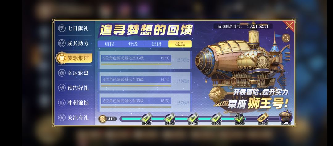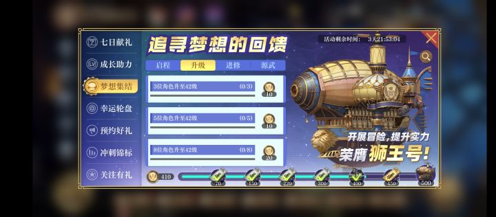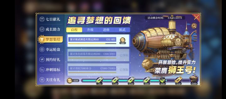 梦想集结,拿到500点需要做的任务,给大家发出来做个参考,大家少走弯路,7天之内是可以拿到拿到“狮王号”的。