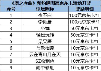 恭喜以上在《魔之序曲》预约晒图赢京东卡活动中获奖的勇士,请在12月14日18时前主动添加登记工作人员QQ:226802514,备注【tap预约晒图——XXX】,如未在规定时间内添加且提供有效信息将视为自动放弃领奖,后续不作补发,请熟知~
