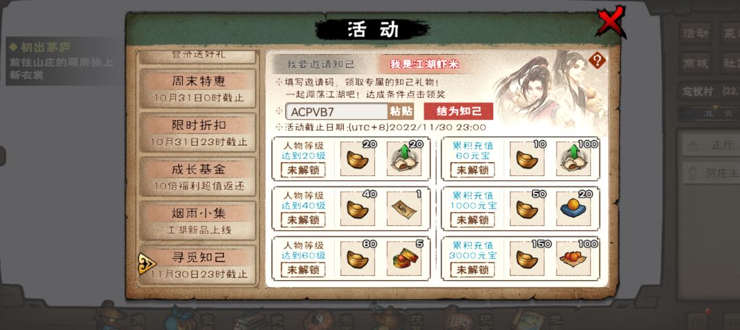 11,开局没有填知己码,少了一大堆资源,右上角点活动,点寻觅知己,选择我是江湖虾米,填入 ACPVB7 ,点击结为知己,可领大量资源