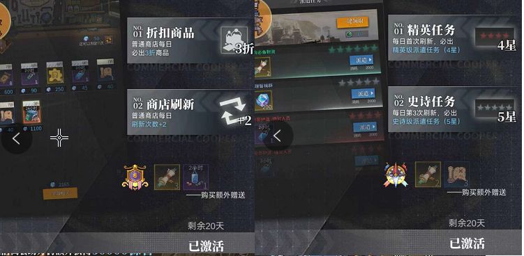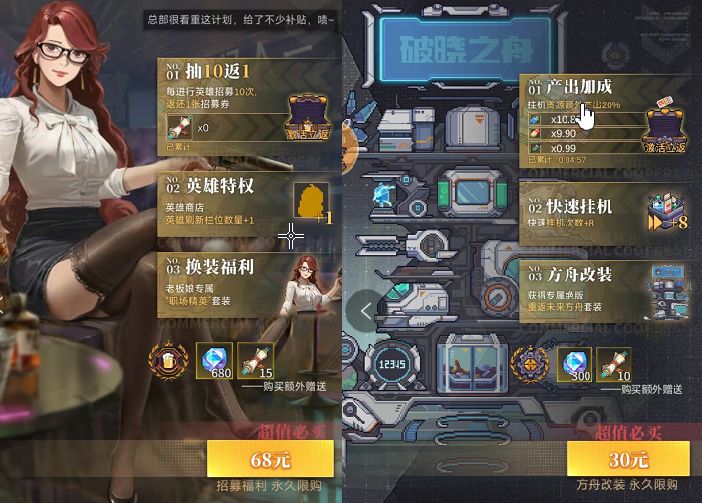 然后是破吓跑破晓之舟和黎明之光,资源额外产出20%、快速挂机+8次、招募券抽10返1。个人觉得对于想长期玩的舰长老爷是很有必要的。买到这还可以免费额外获得一个嫦娥,每天多领到400源石,一共30天就是12000源石,不亏不亏。