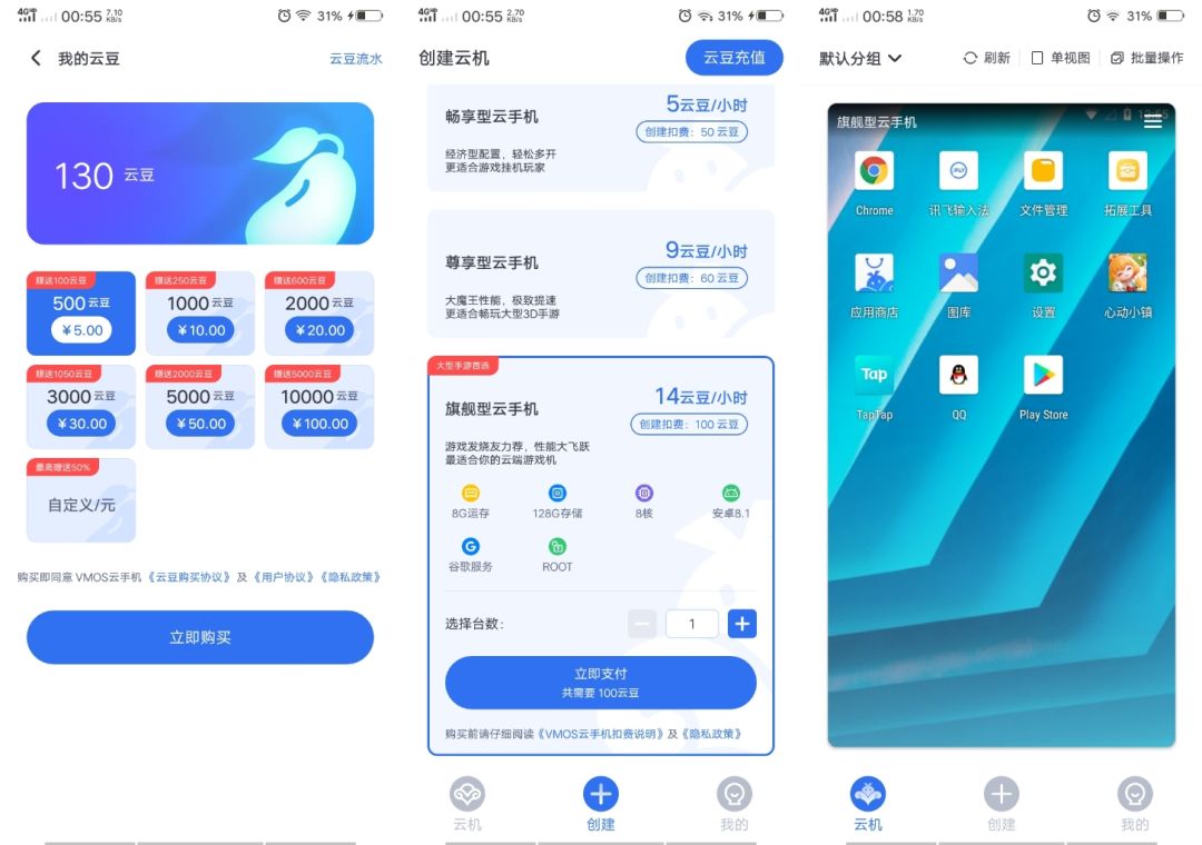 使用VMOS云手机的原因是它性价比高、性能强悍、功能齐全。创新按小时计费,随时可暂停,充值¥5.00(500云豆+赠送100云豆)创建旗舰型云手机,一天玩5小时刚好可以玩一周(暂停&关机情况下)。VMOS云手机还有拓展工具,提供ROOT、谷歌三件套、更换机型。云机还支持是否开启全屏、云机内截频,云机外复制粘贴等。