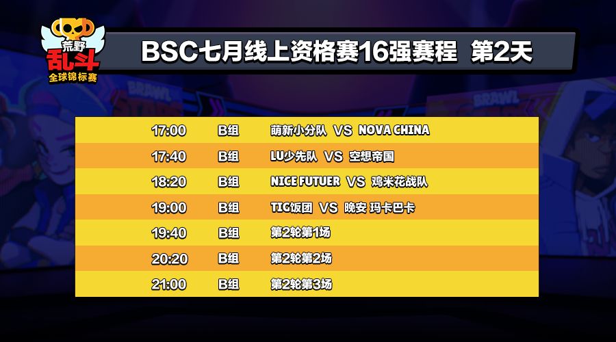 而第二天的比赛将会围绕B组的8支队伍展开,明天下午17:00,继续锁定直播间,成功晋级的三支队伍将同A组的前三名、全民冲杯赛最强战队Nova China和NICE极夜,一起会师七月上海线下月度决赛!