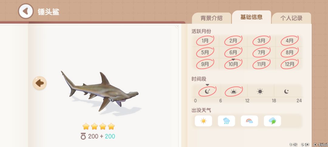 锤头鲨:获取地点,海钓派对可钓到(大金色)。获取时间,全天0~12。
