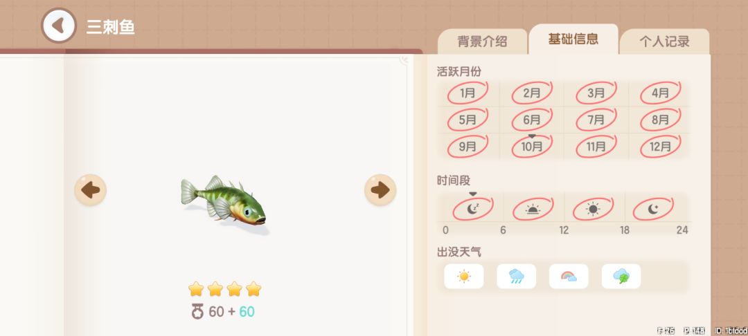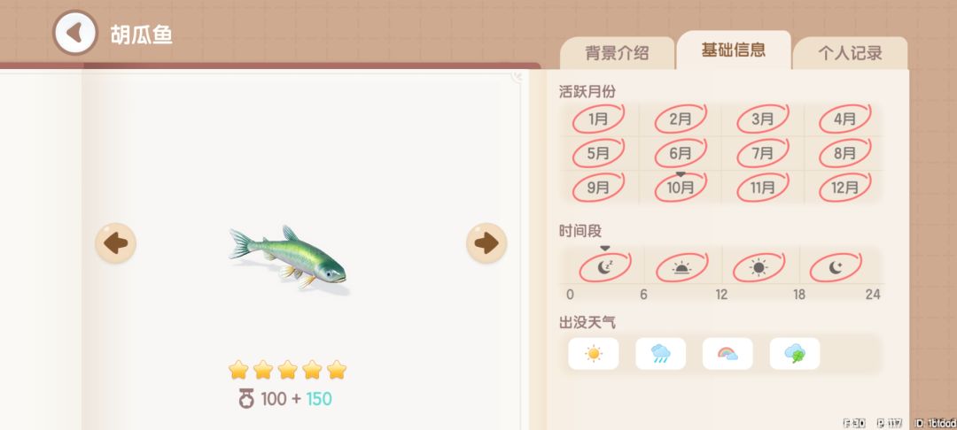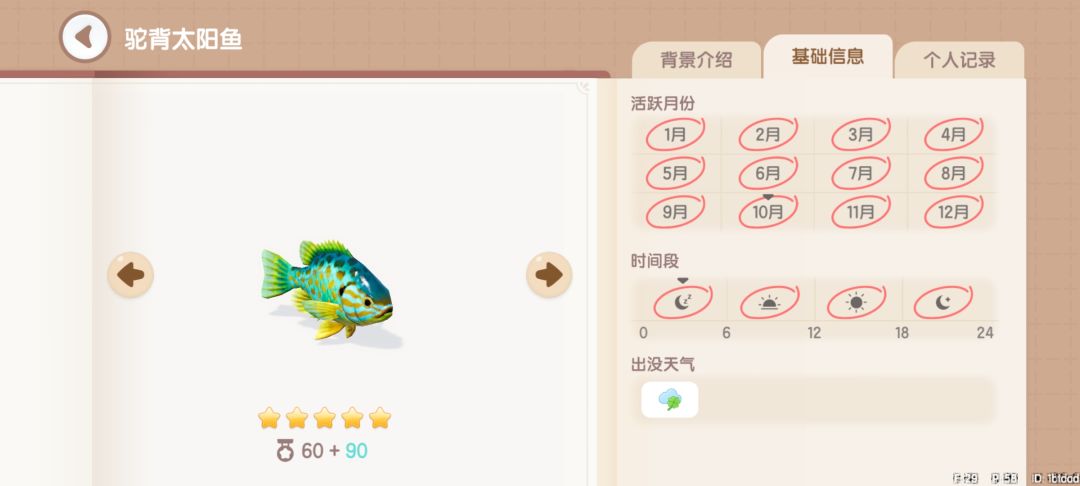 驼背太阳鱼:获取地点,地图上的所有湖中均可钓到。获取时间,幸运天0~24。