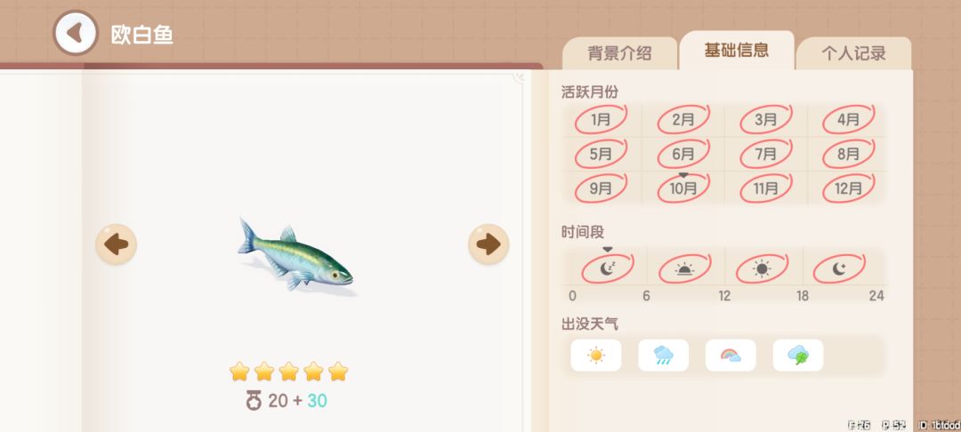 欧白鱼:获取地点,地图上的所有湖中均可钓到。获取时间,全天0~24。