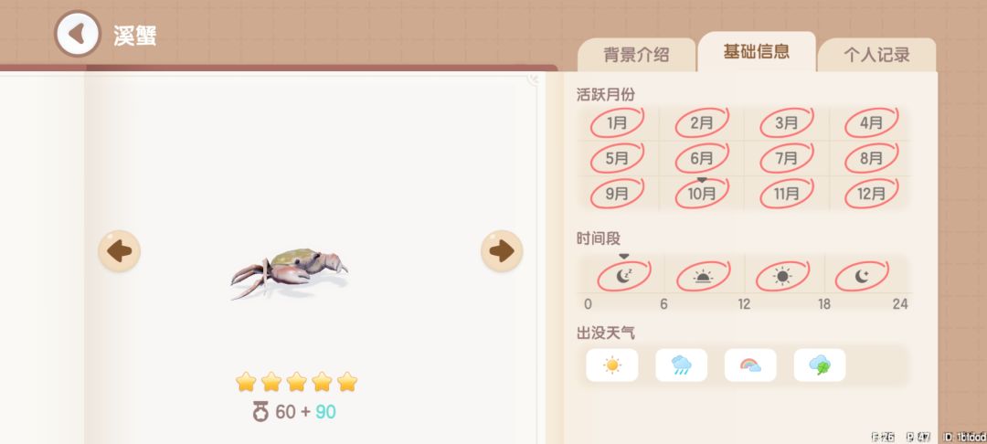 溪蟹:获取地点,地图上的所有湖中均可钓到。获取时间,全天0~24。