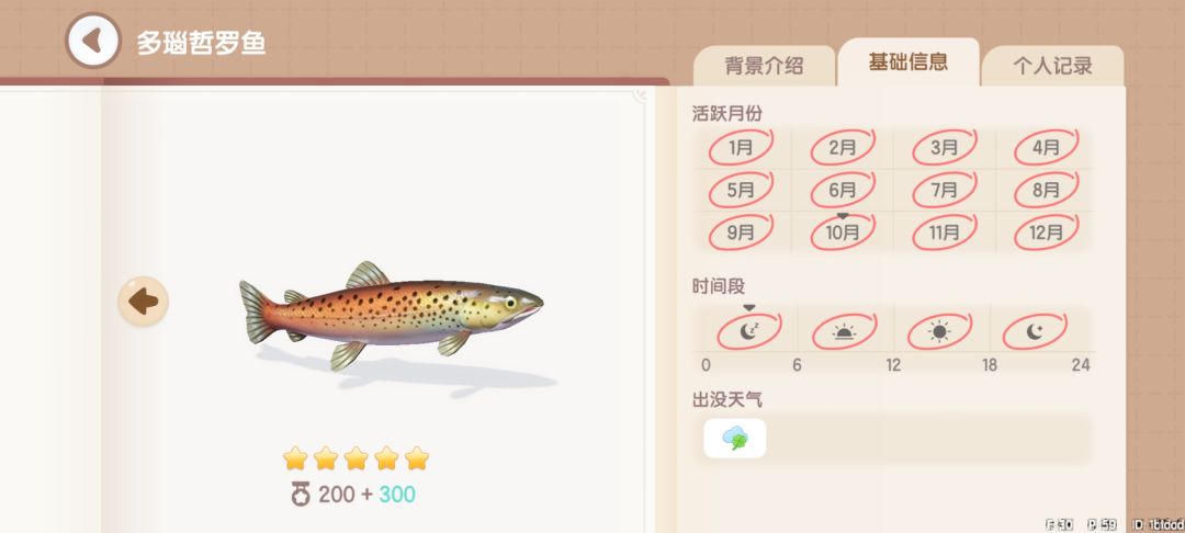 大马哈鱼:获取地点,地图上的所有河中均可钓到。获取时间,全天0~24。