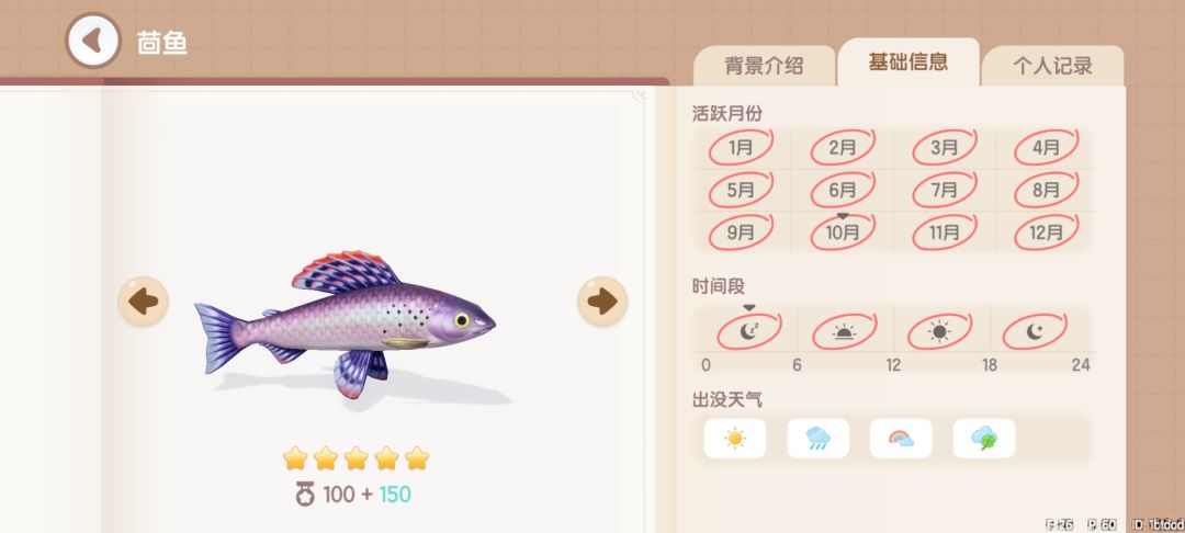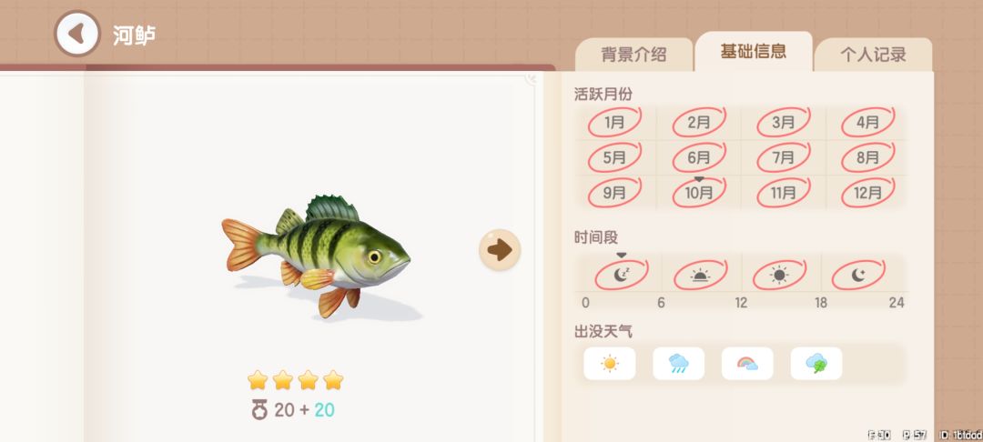 蝌蚪:获取地点,地图上的所有湖中均可钓到。获取时间,彩虹天和幸运天0~24。