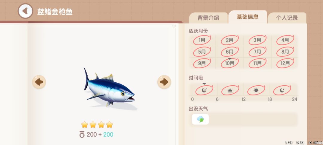 鲣鱼:获取地点,地图上的所有海域均可钓到。获取时间,全天0~24。