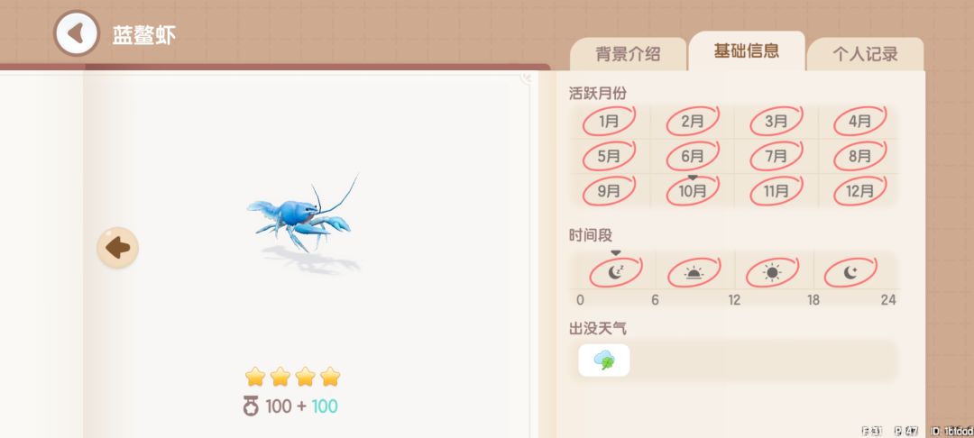 蓝鳌虾:获取地点,地图上的所有湖中均可钓到。获取时间,幸运天0~24。