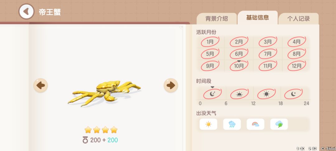 帝王蟹:获取地点,海钓派对可钓到(大金色)。获取时间,全天0~24。
