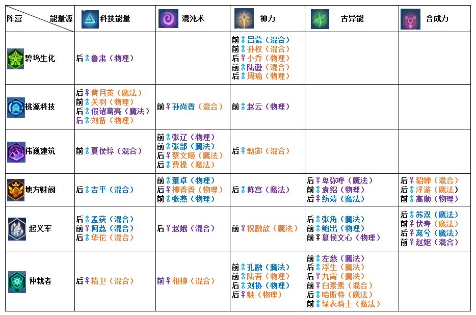 图中角色名称对应能量源类型和阵营所属;前、后代表站位;橙色为SSR、紫色为SR、蓝色为R;♂代表男性♀代表女性;括号内为伤害类型。
