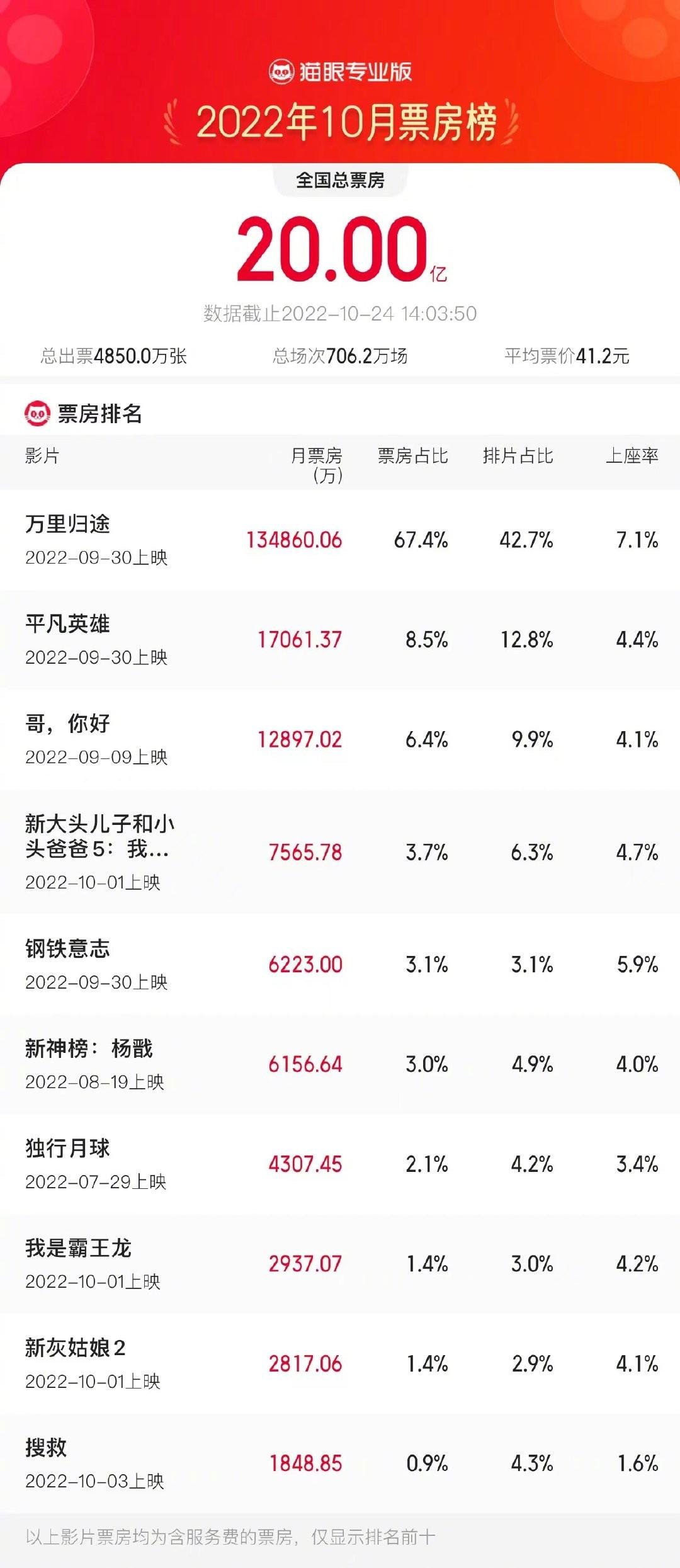 2022年10月总票房破20亿!《万里归途》13亿领衔