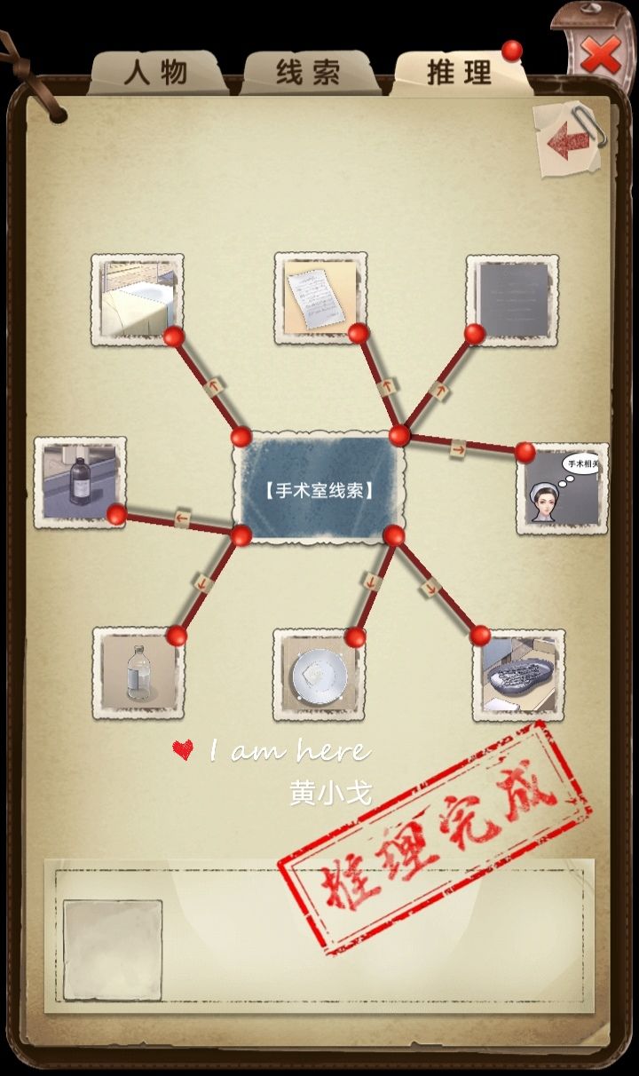 疑似凶器→【插在胸口的刀】、【剩下的汤渣】、【生理盐水】、【手中的掌心雷】、【铁盆里的纱布】、【两只纸箱】、【一瓶药剂】