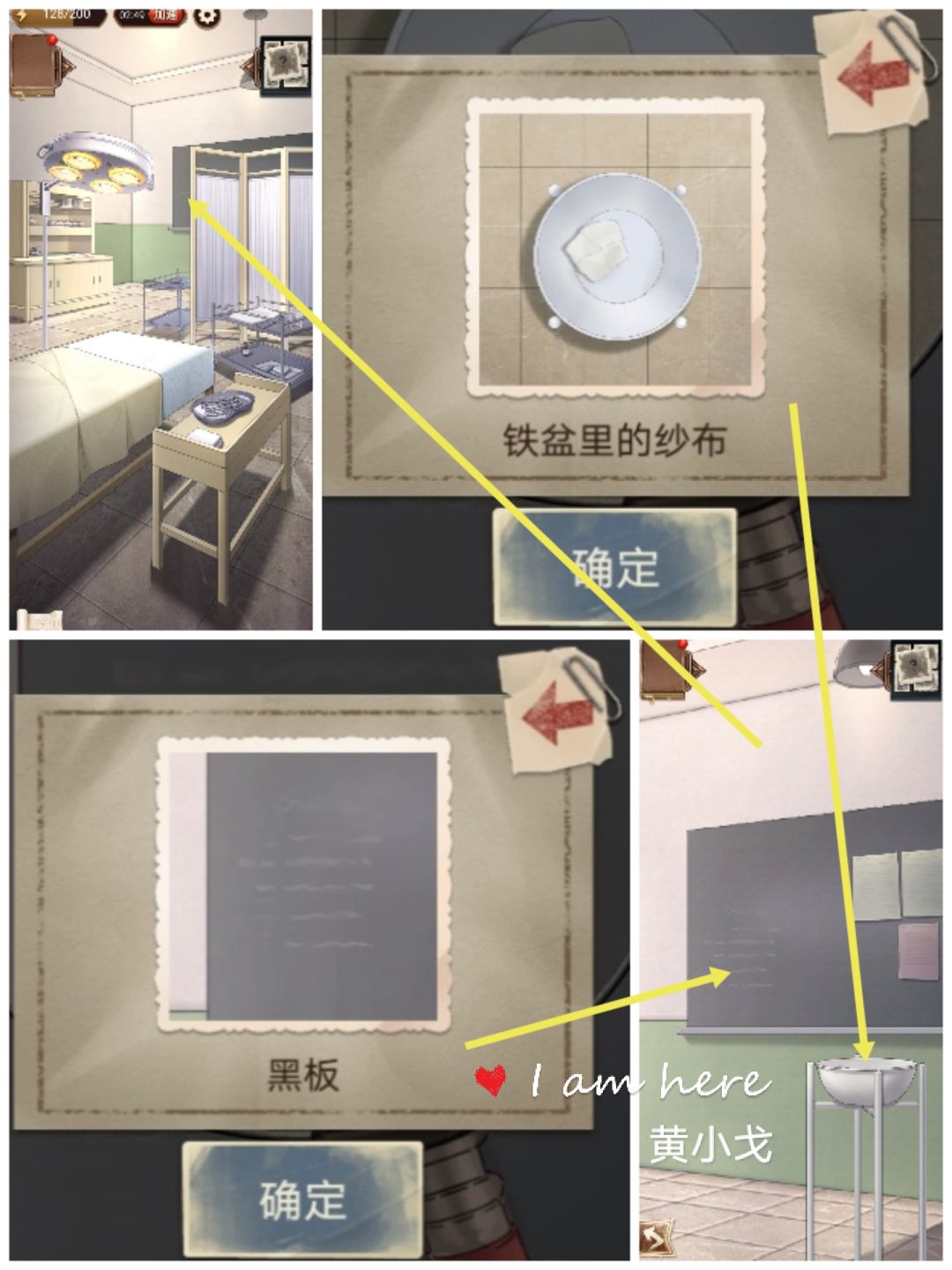 手术室线索→【手术台】、【一份病历】、【黑板】、【陆召娣的说法】、【手术器械】、【铁盆里的纱布】、【生理盐水】、【一瓶药剂】