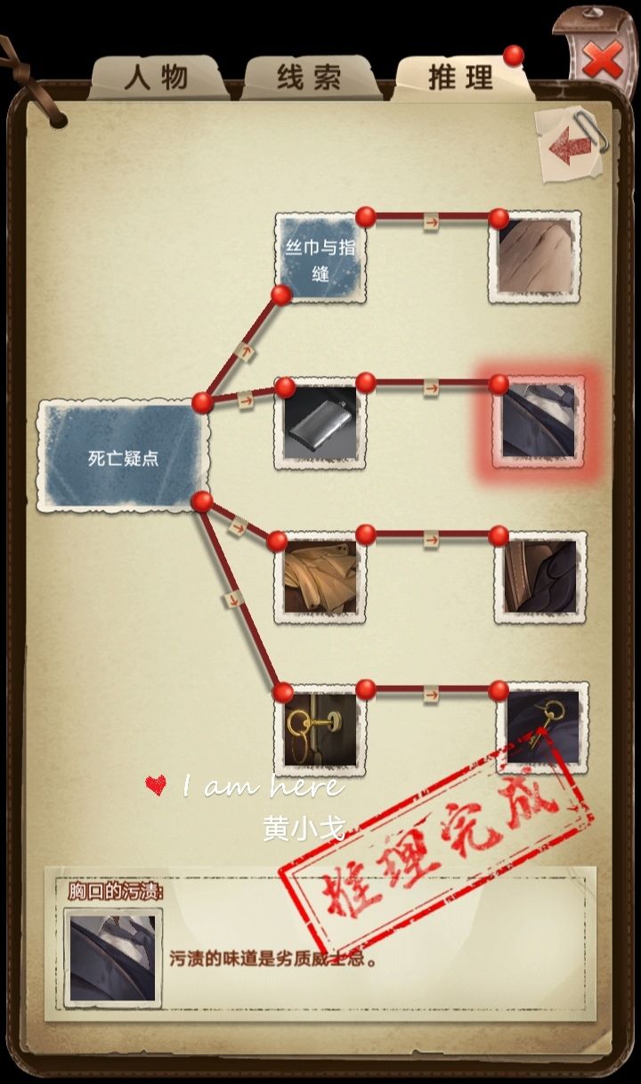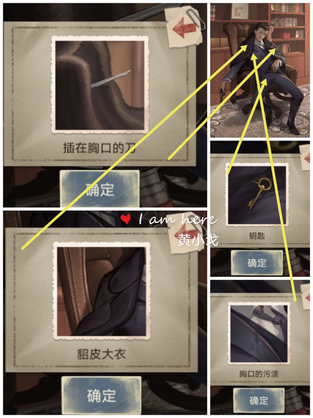 5.尸体的身体:【胸口的污渍】、【插在胸口的刀】、【钥匙】、【貂皮大衣】