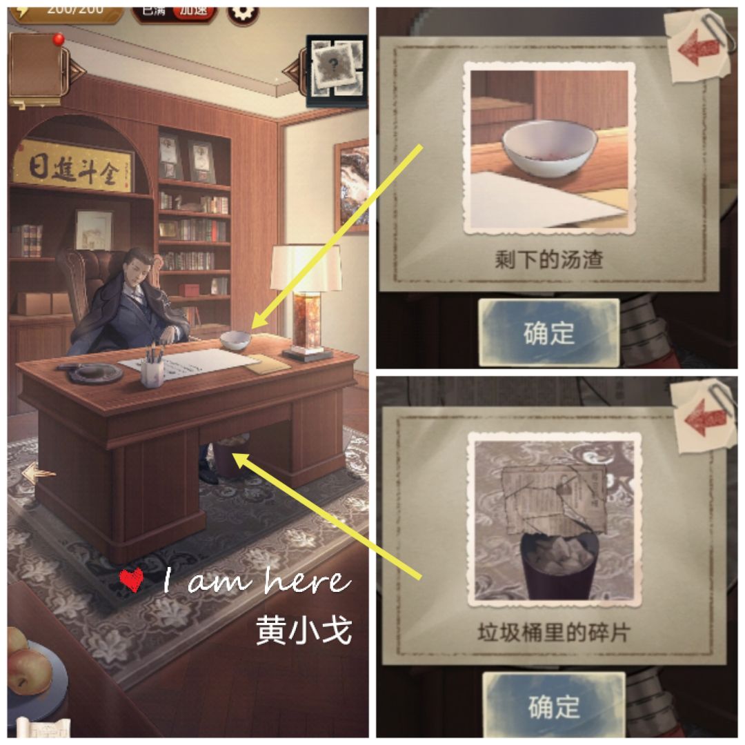 雷世荣办公室线索→【打开的衣橱】、【窗框上的子弹】、【一只木盒】、【剩下的汤渣】、【两只纸箱】、【程峰的欠条】、【垃圾桶里的碎片】