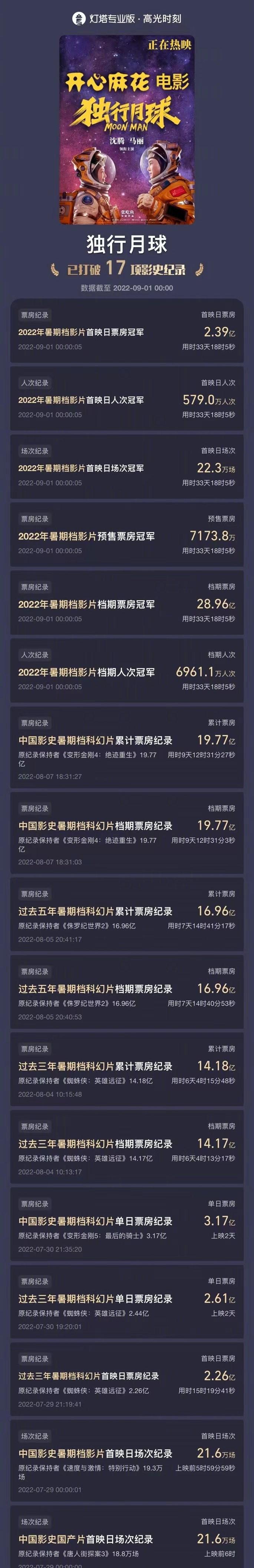据灯塔专业版数据,截至密钥到期,《独行月球》最终票房为31.0亿,共打破17项影史纪录。