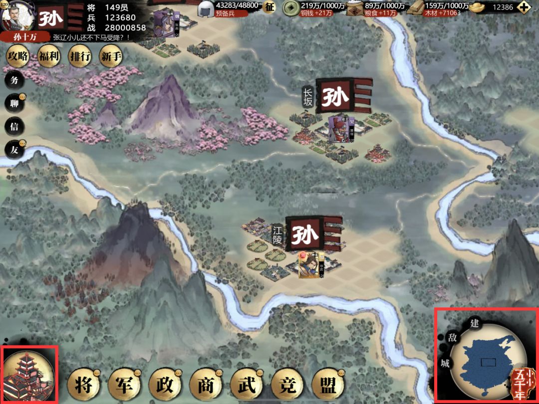 最下方三个按钮:朝代传记对应副本,都城即前往都城建设界面,千年战史可以前往SLG新玩法界面。