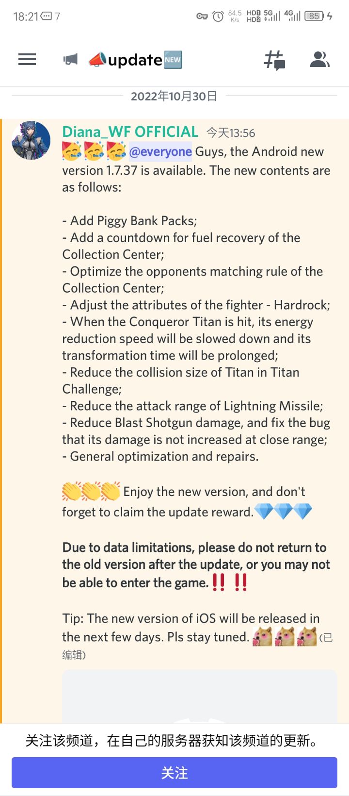 谷歌版1.7.37已推送更新。