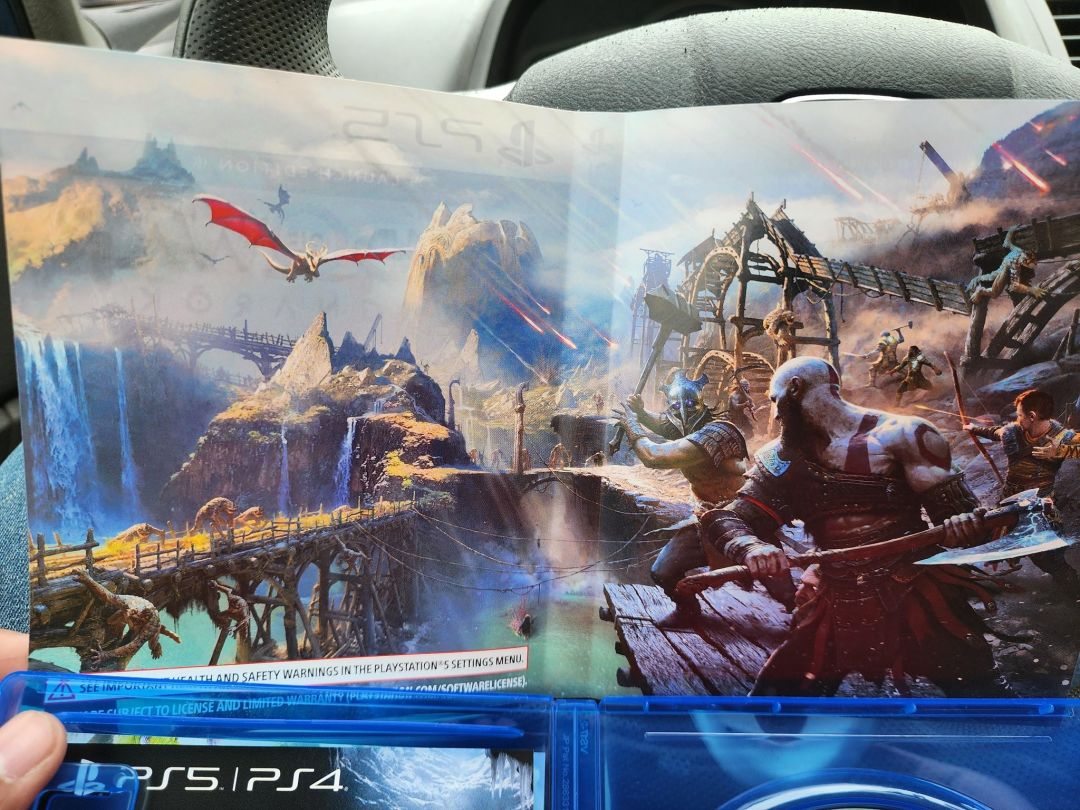 《战神:诸神黄昏》还有十天就要正式发售了,有部分网友已提前拿到了游戏的实体盘,并晒出了PS5版游戏封面背面的图案,为奎爷与阿特柔斯一同战斗的插画。
