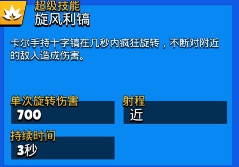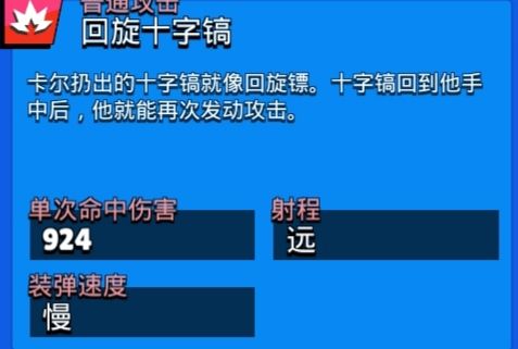 卡尔的普通攻击是将十字镐向指定方向扔出,当镐子抵达目的地时,将会向着卡尔方向返回,过去和回去都会向沿途的敌人造成伤害,若来回两下都中可打出1848伤害,这个伤害对于一般射手来说不低了,但难的就来回两次都打中(对此有一个比较好的技巧:跟别人保持在攻击距离最远的那一段,这样只要预判中,即可瞬间打出两层伤害)卡尔还有一个很特殊的普攻机制,就是只有在扔出的镐子回到手里的时候,才会有下一发子弹,也就是这个角色存在一个没有普攻的空档期,虽然这个时间不长,但如果被其他人抓到那么是很致命的,比如艾德加跳大(阿飞冲大,桶子滚大),原本卡尔并不是那么怕艾德加,因为有二妙具可以随时逃跑,但如果被艾德加抓住这个空档期,再扔出镐子的时候跳大,那你基本上是等不到你镐子回来,你就已经无了,所以如果视线中出现了类似于艾德加之类的角色,一定不要轻易的将普攻扔出。但对于这个机制,我们也可以加以利用,就比如若贴墙,用普攻即可快速刷新出普攻(全荒野最快刷新普攻),用来打箱子非常方便,但他也不是可以无间断使用,当镐子收回到手里的时候,你不能直接扔出,因为他会有一个小小的后摇(会卡那么一下);