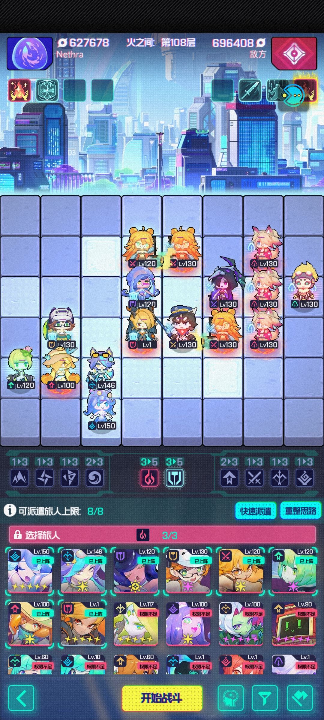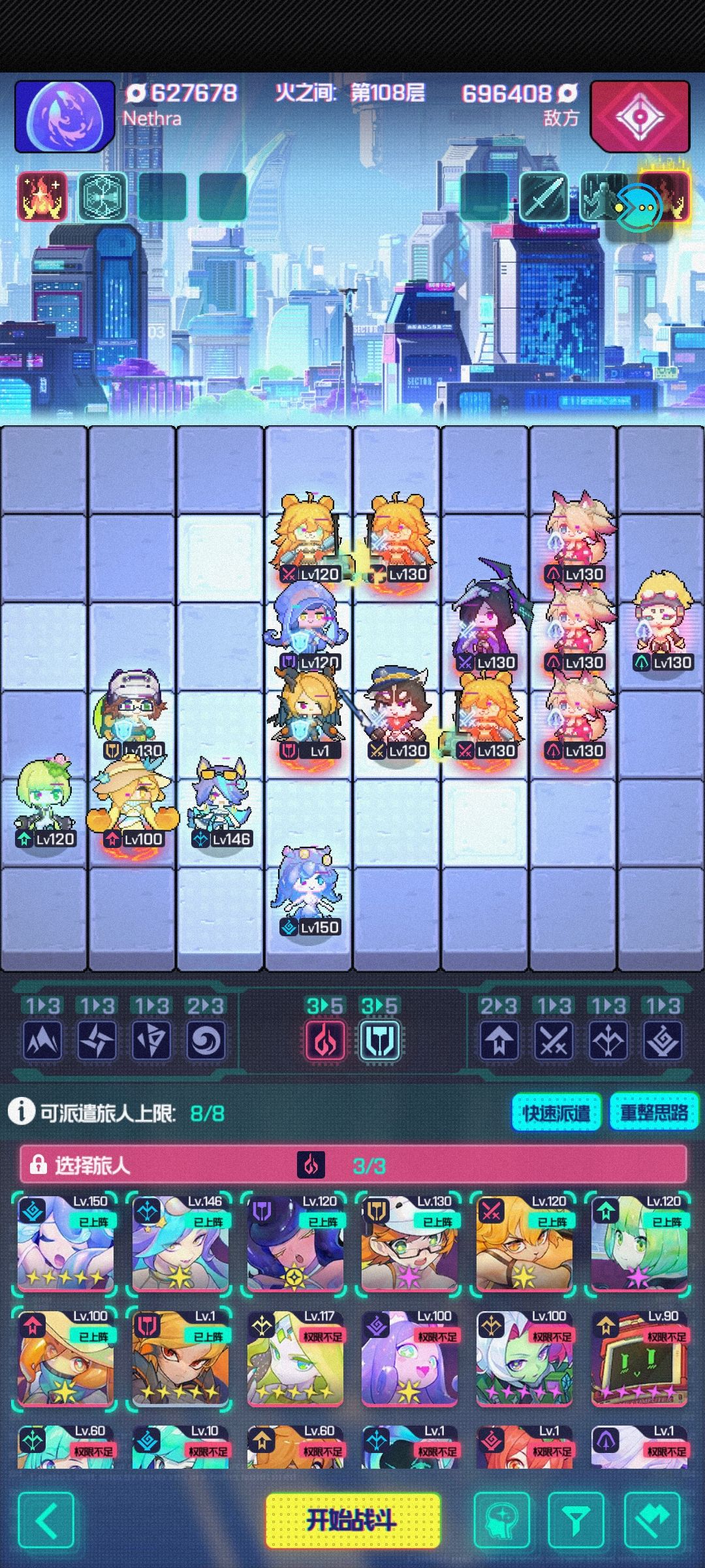 最右下角的是这个团队的核心可以看到水火土风都有的,右边三个是卡位置,送能量,以及不同元素塔元素要求用的。