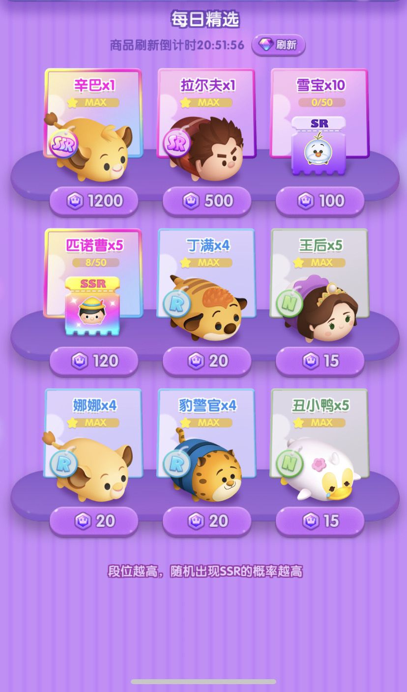 7日份的SSR碎片:爱丽丝x4、艾莎x3、朱迪x1、辛巴x3、野兽x1、史迪奇x7、大白x2、毛怪x4、莫阿娜x2、米格x1、白雪x5、木兰x1、乐佩x1、爱丽儿x1、胡迪x2、巴斯光年x2、闪电麦昆x2、灰姑娘x3、爱洛x1、福运米奇x1、斑比x1、