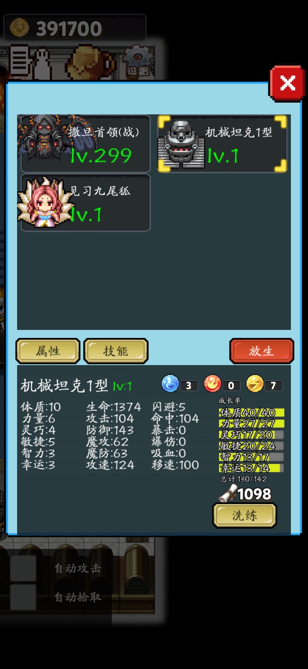 第一个卡关点差不多在35层,前面都能靠闪避和宠物吸引火力加走位或者复活莽过去,35隐藏boss爱丽丝的魔法输出是没法闪避的,只能硬抗,而且伤害非常猛,坦克宠物魔抗低基本扛不住,这时候我们就需要回到25层以上挂机,先把蓝宝石套凑齐,属性一样洗暴击爆伤物攻,然后等一把橙色勇者弓,洗3个五连射或者2个五连射+一个二连射爆炸箭之类,然后开始洗属性点,保证暴击率70的前提,把点数加到体力,大概投入200-300点左右体力,把血量拉到3-5万会比较安全,剩下点数全加力量,属性加成配合衣服50级左右,能抗住boss一波爆发,这时候我们大概100级左右,随等级的武器加差不多有2000+的面板攻击,配合吸血光环,基本可以抗住了,具体属性自己可以微调下,实在扛不住就去前面练级,最多120-140可以稳挂了
