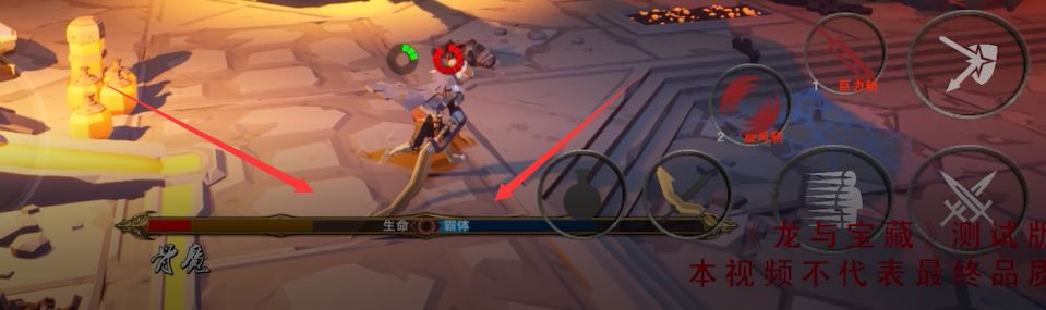 左面的箭头指向的红色槽为怪物生命值,右面蓝色槽为怪的霸体值,玩家攻击敌人会同时消耗敌人的生命值和霸体值,当怪物的霸体值消耗光的情况下,玩家攻击怪的时候,只要怪物的招式不是强制霸体效果,都可以打断它的攻击,此时怪物的霸体值会缓慢恢复,属于玩家连招的安全期,