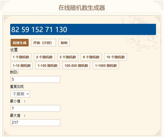 首先抽取「魔渊实体周边」奖励,在1-217中生成5个随机数: