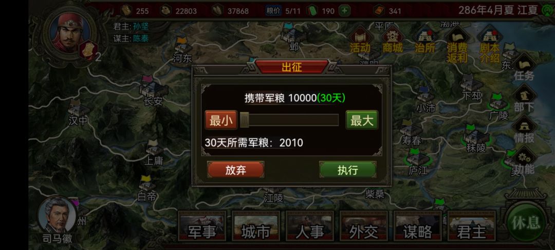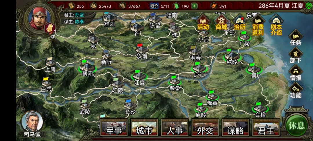我吴地开的局,会稽,秣陵,广陵是空城,为了占满空城,和武将没行动就邀请浪费了两三个月时间,最后9个月通过了