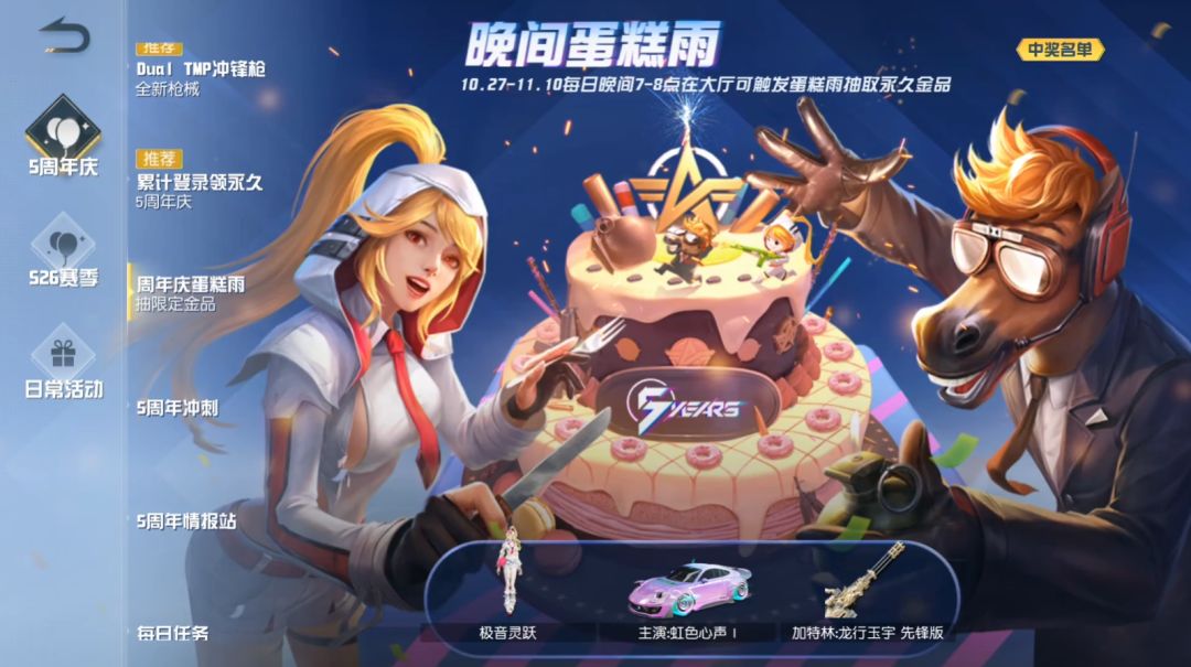活动期间,每日晚间7-8点在大厅可触发蛋糕雨抽取永久金品道具(包括极音灵跃、主演:虹色心声Ⅰ、加特林:龙行玉宇 先锋版)。