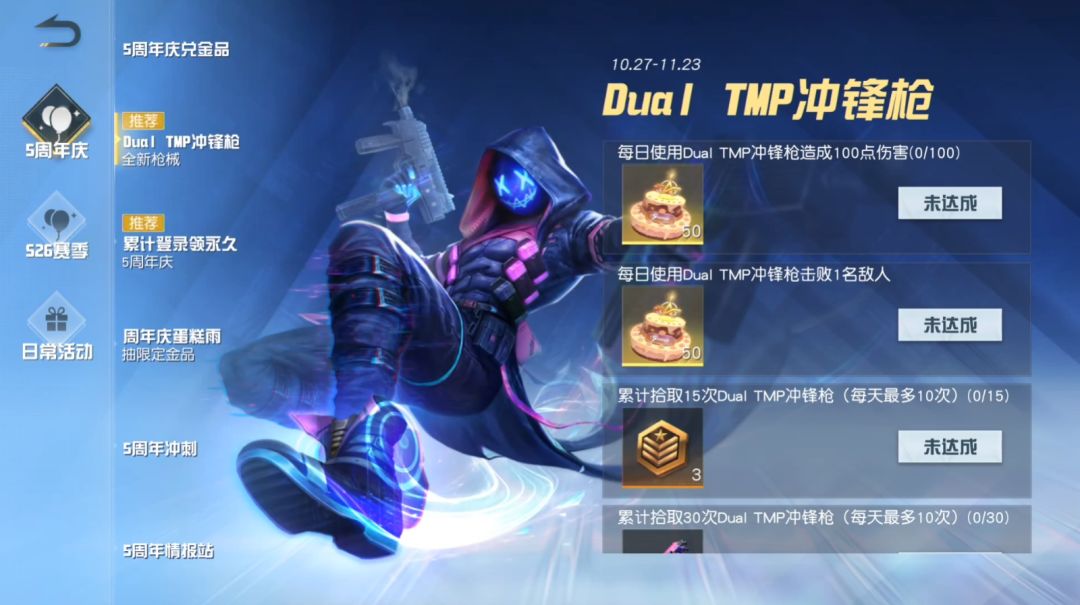 在游戏中使用Dual TMP冲锋枪达成对应目标,即可领取五周年蛋糕和至尊军需勋章,更有Dual TMP:虹波扰动等你来拿!