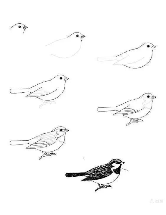 小朋友们,这是一只可爱的小乌鸦,它在绘画技巧当中就有7个步骤,现在我就来教你们画小乌鸦的7个步骤。1.第一个步骤,先画出小乌鸦它的头,眼睛,还有嘴巴。2.第二个步骤,再用线条描出小乌鸦它的身体。3.第三个步骤,再把小乌鸦它的身体画上描边线,然后,再描出小乌鸦它的翅膀,还有羽毛。4.第四个步骤,再把小乌鸦它的翅膀和羽毛画上描边线,然后,再描出小乌鸦它翅膀中的条纹,还有,再描出小乌鸦它的爪子。5.第五个步骤,再将小乌鸦翅膀中的条纹画上描边,还有画上小乌鸦它的爪子,然后,再描出小乌鸦脖子的条纹。6.第六个步骤,再把小乌鸦脖子中的条纹画上,然后,再描出小乌鸦它身子的图案。7.最后一个步骤,再将小乌鸦它的头,身子,羽毛给涂上颜色。这就是一只可爱的小乌鸦,用7个步骤就画好了。