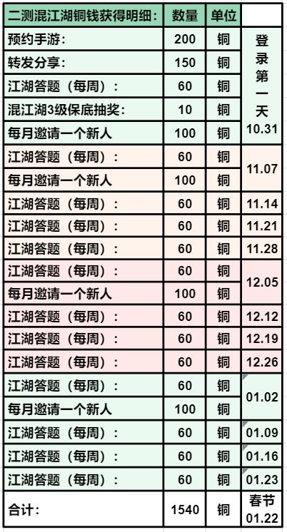 根据官方规则获得1500铜钱获得资格,以下是现有活动,不涉及抽奖的情况下,保底获得资格的时间计算,没有资格的小伙伴纯签到,脸极黑的情况下,新年第二天保底获得资格。