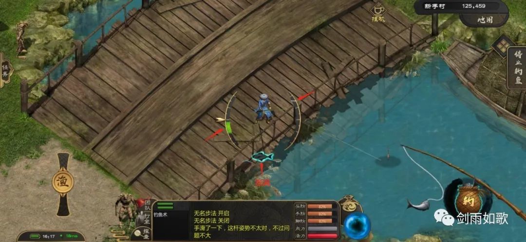 回到之前的话题:我们持续一段时间后就会发现下方鱼形进度条正在慢慢的增长,等他涨满我们就钓鱼成功了,若此步骤耗时过久也会超时失败的,同时提醒各位大侠,左右两侧记得控制好,不然下方鱼形进度就会骤减,你没听错,是骤减,快到吓人。