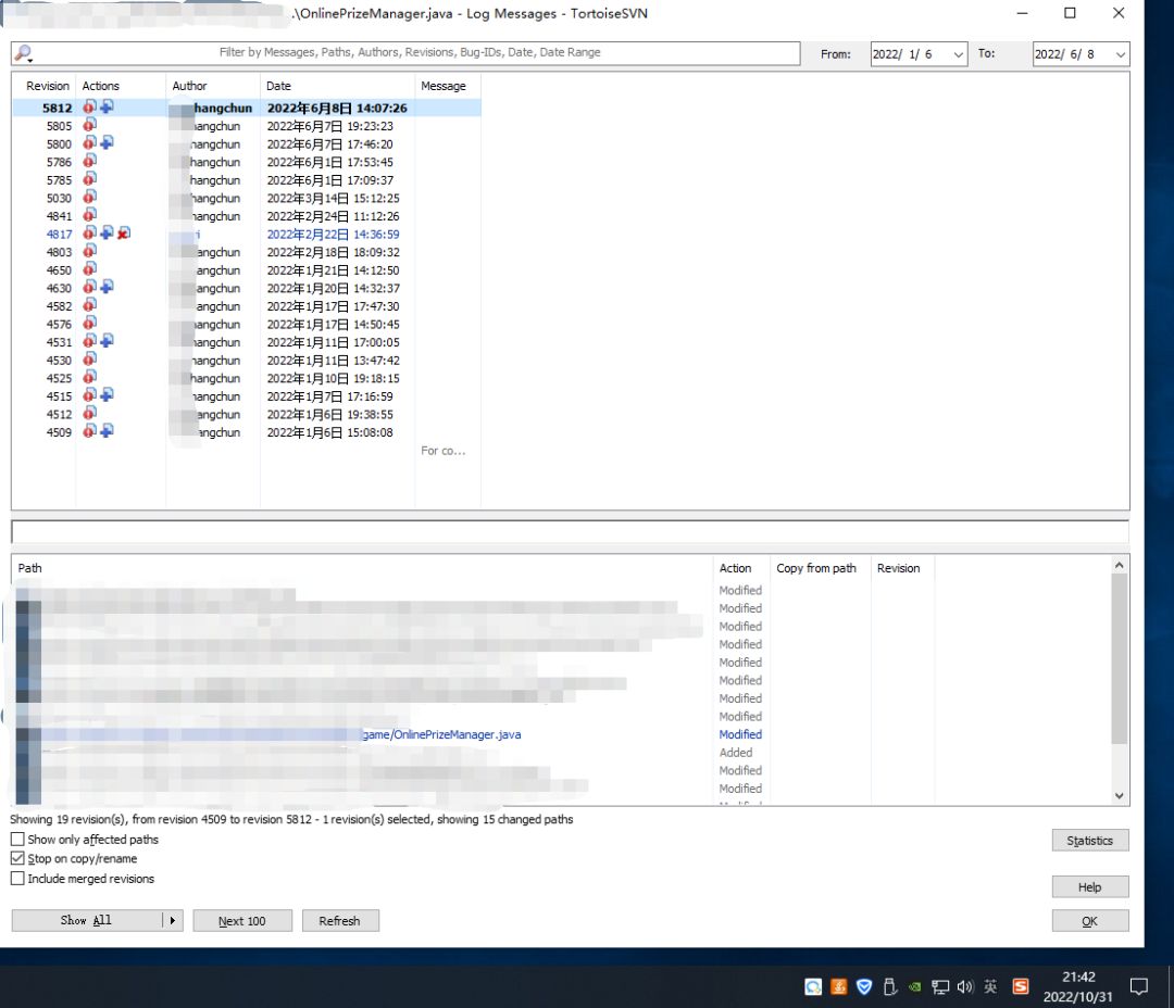 从图中所示,我们在该功能开发完成后,包括在游戏公测后就没有对挂机收益相关代码进行过变动。图中OnlinePrizeManager.java为挂机收益部分的代码文件,通过这张SVN截图可知,该代码文件最后变动日期为2022年6月8日。PS:SVN为开发常用版本管理工具,会对开发过程中的小到每一个文件每一张图进行管理,并且可溯源与追踪。