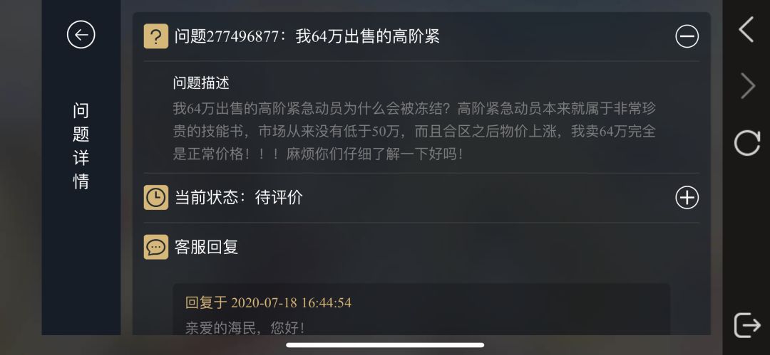 贝儿小姐姐看过来,高阶紧急动员一直在我们区价格都是50w以上,前两天运气不错开到一个,以64w的价格卖掉,结果金币被冻结。64w一本高阶紧急动员完全是很正常的市场价格,我也没有和任何人私下商量交易,请你们调查清楚!!