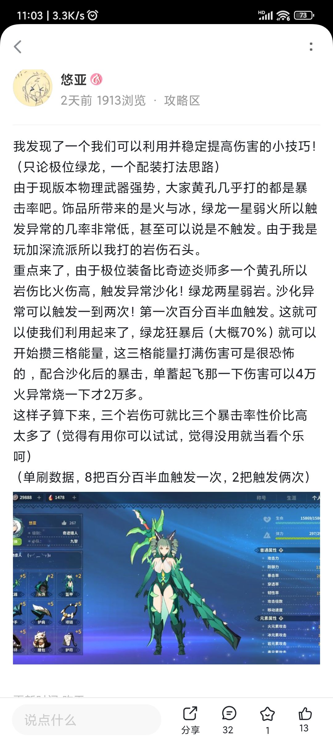 绿龙两星弱岩,所以岩异常非常好触发。百分百半血触发一次,偶尔触发两次。正好极位装备三个黄孔使得岩伤大于饰品的火伤。两星弱岩,岩点伤也很高。5级石头获取困难,培养成本高!以下以4级石头为例。(后期全上五级石头的话,估计易伤会溢出,可能要拆一两个换爆伤)无伤不是字面意义上的无伤,只需要保持满血即可,不要怕!就是刚!!!