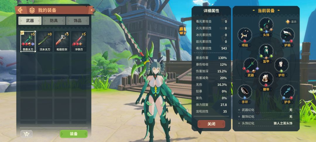 现有极位装备由霜羽套升级,属性为爆伤吸收和17%爆伤。太刀攻速适中,攻击次数少,我并不觉得暴击爆伤流适合太刀。不像弓箭一发三箭,回旋镖一次四五次伤害!太刀轻重击蹭能量的时间占比很高,伤害加深反而比较适合,偶尔出个暴击就更好了!因此装备选择绿龙衣服和头甲即可。(高星怪有“韧性”说白了就是暴击爆伤抵抗!本次更新降低了韧性,至于降低了多少,那就不知道了)