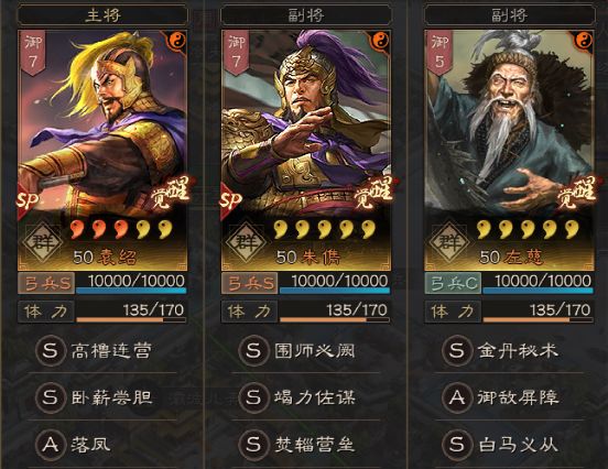 SP袁绍自带战法高撸连营,箭楼能够提供非常稳定输出以及不错的缴械控制,且袁绍为主将时,每回合还会额外填装一次,进一步增加袁绍的伤害。配合上白马先攻以及全加点速度,缴械控场天克突击队伍。携带卧薪尝胆与落凤,是为了进一步增加队伍的控制,因为单只有缴械的话队伍非常害怕主动队伍,而卧薪尝胆的震慑以及落凤的技穷能够很好的弥补这一缺点。