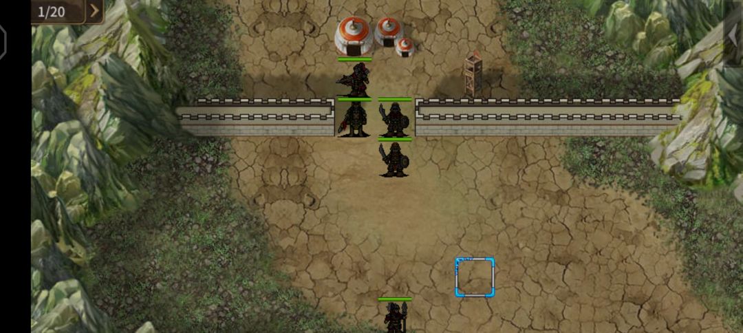 第六回合主动回合没什么可动的,被动回合就要归位了,正常情况下顺序应该是马超,魏延,雷铜,吴兰,严颜,严颜已经送了,现在这个图里门口的铁甲车应该是雷铜的归位点,魏延站在吴兰的归位点,雷铜站在了马马超的归位点,按按顺序归位,马超就被挤偏了如下图