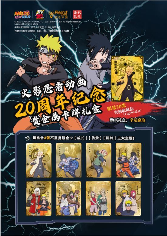 火影忍者动画20周年纪念贵金属卡牌礼盒由《火影忍者》动画中国版权代理皮乐中国授权,正版潮玩开发商漫代聚焦研发,11月14日正式上架Z宇宙漫代聚焦微信小程序及得物APP。