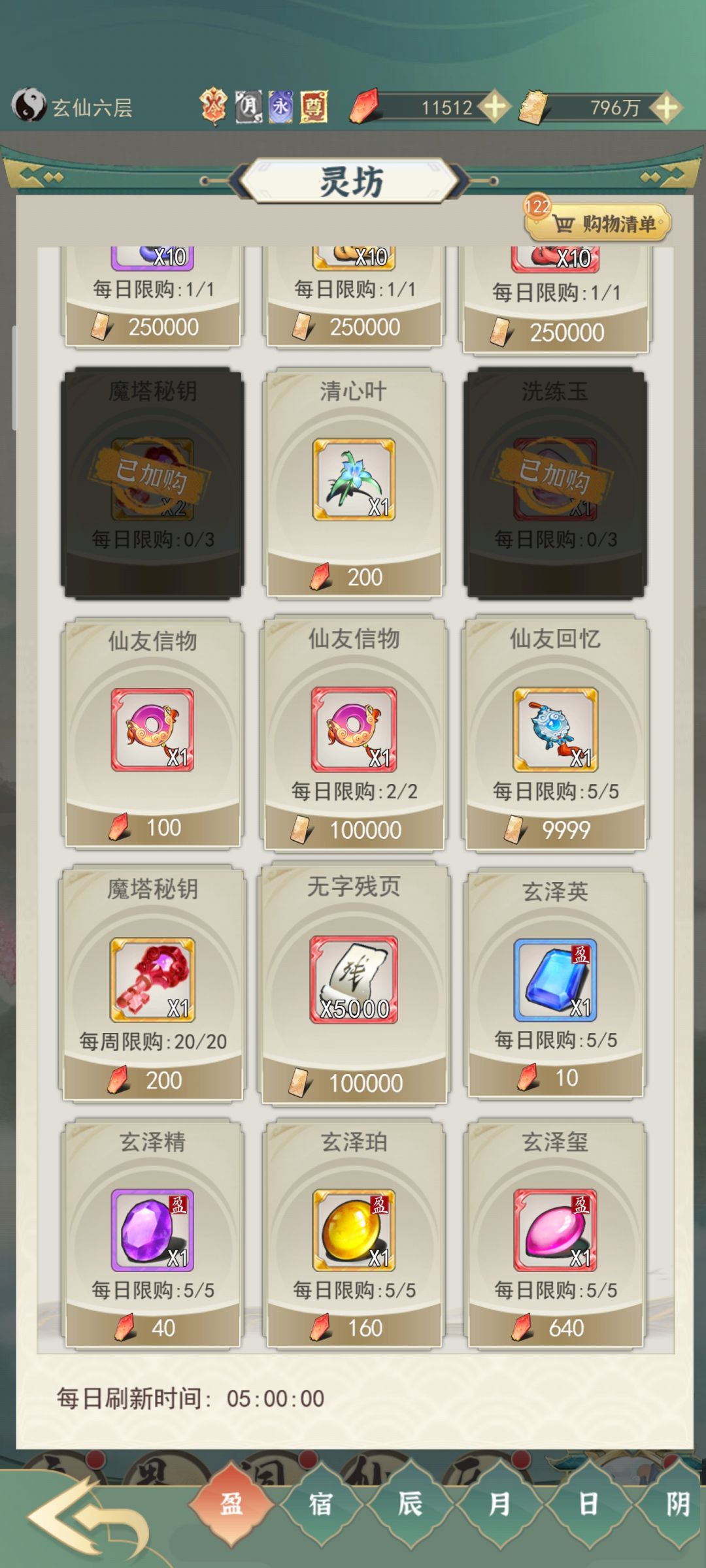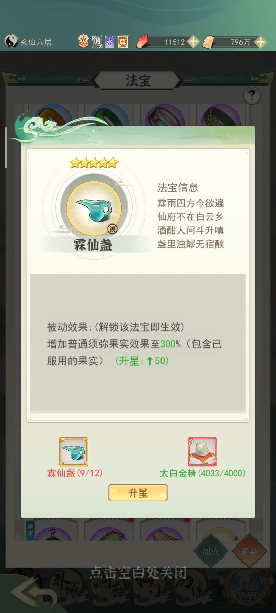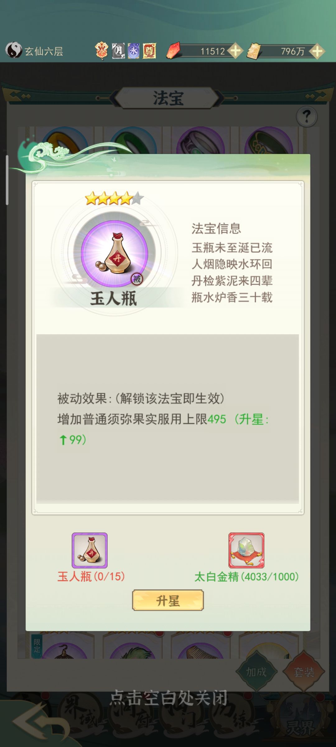 最后,上灵界后就可以做丹药了,人界坊市里的五行精一定要每天拉满,飞升灵界之前也可以攒一些,丹药优先做攻击生命和全攻,丹药等级越高花费的材料越多,所以优先做级别低的丹药。另外得到的传说自选和史诗自选法宝宝箱一定要选霖仙盏和玉人瓶,这是平民神器。