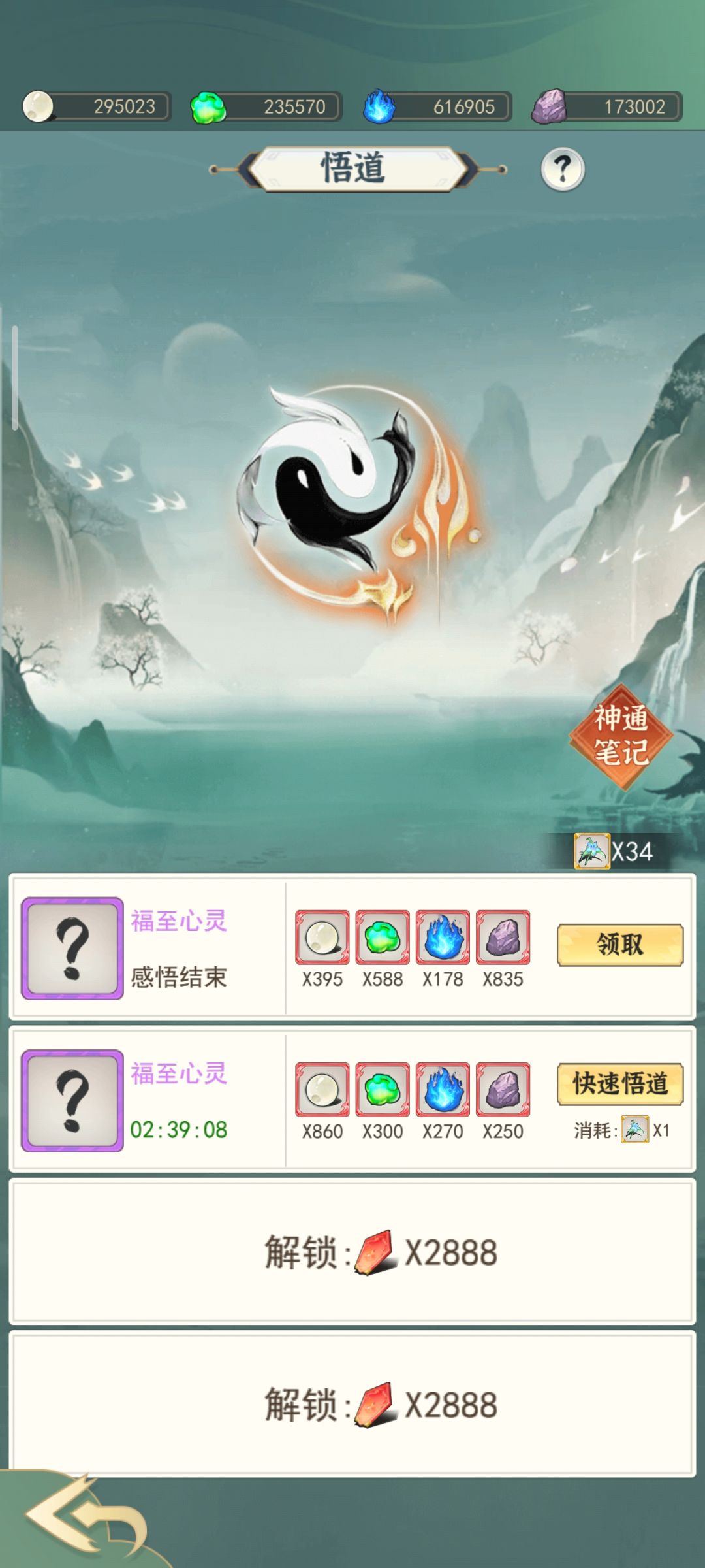 悟道可以用四种灵感合成神通,不同数量的灵感配方会出不同品质的神通,概率出红品质神通的配方可以加群670074534公告里获得,神通槽位可以先不开,一个已经够用,灵感可以通过灵界的建筑产生,类似于人界的今雪堂,灵界的建筑没必要等级很高,随便点个几级就够了,后期灵感根本用不完。合成的神通可以装备在人物技能上面(注意:只能安在你出战的技能上面才有效)。