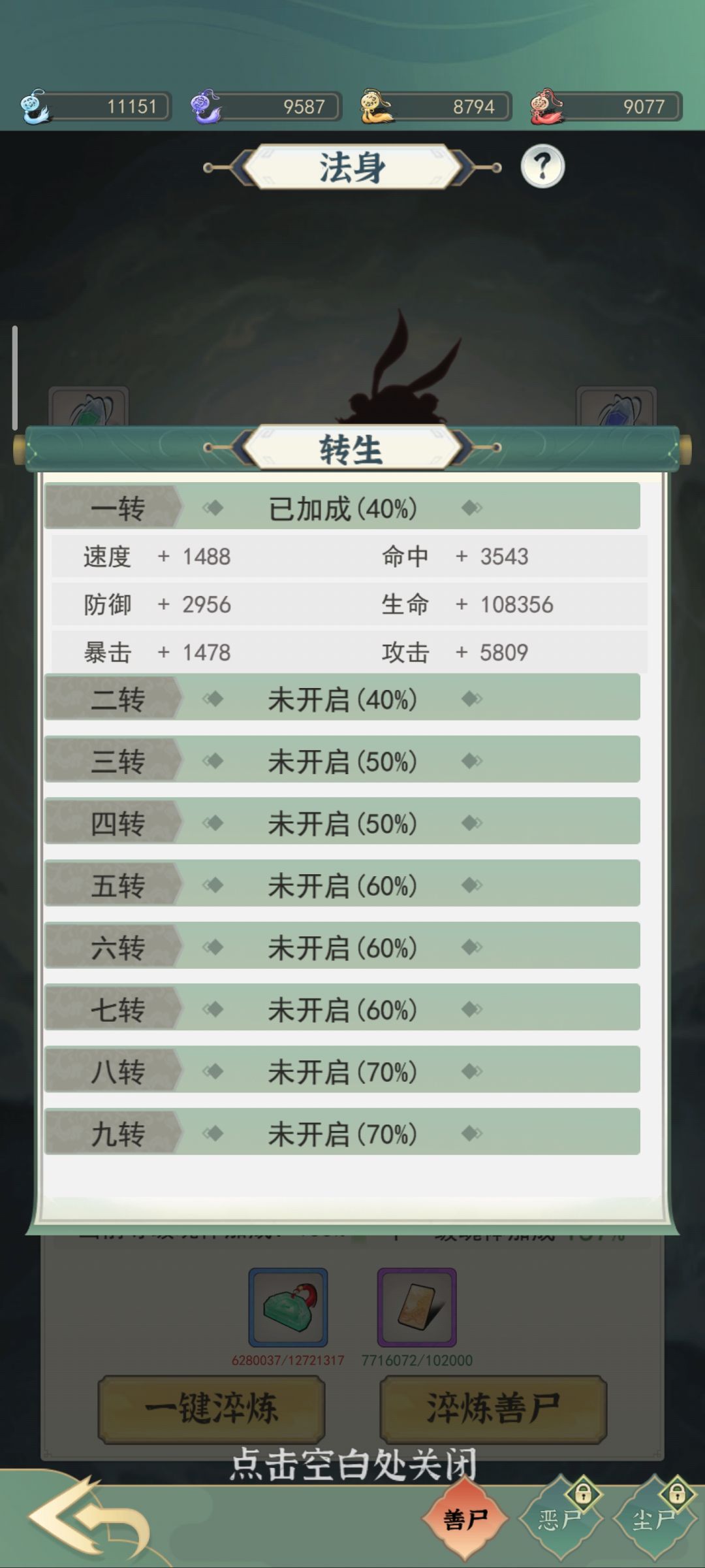 首先解锁的是其中的善尸,法身可以给本体附加属性加成,善尸有六处魂体分别给本体附加攻击、速度、生命、防御、暴击、命中属性,主要淬炼能增加攻击速度生命的魂体,淬炼魂体的材料在灵植园获得,仙玉充足的小伙伴可以把浇水拉满,性价比很高(注意:三种材料种子可以合成更高级的种子,一定要用更高级的种子种植才有性价比)。淬炼善尸可以用来提高魂体属性加成,淬炼善尸的材料在魔塔里获得(记得在飞升灵界之前也要把仙门商店里的魔塔钥匙拉满),淬炼善尸到一定等级可以斩尸,斩尸后可以保留善尸其中40%的属性附加给本体(百分比随斩尸次数增加),斩尸后魂体和善尸等级重置。我的建议是魂体的等级可以直接拉满,然后善尸到了能斩尸的等级后就不要继续升级了,留着材料等斩尸完后再用,不留材料直接斩尸会掉很多本体战力。