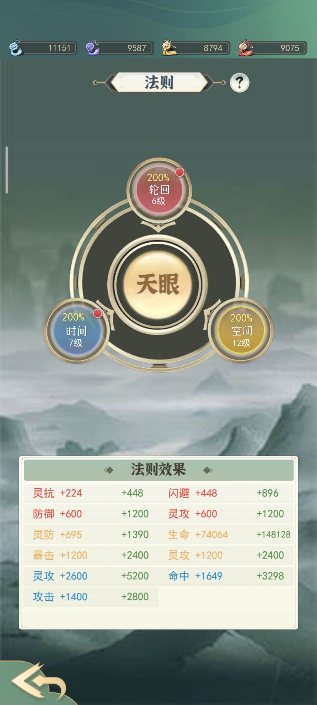 法则的天眼对法则有额外的加成,最高加成效果有200%,一共有三种法则:轮回,空间,时间。建议主要升级空间法则,灵防真的很有用,法则所需的材料在坠星海获得,并且每天都能去掠夺其他玩家的材料。